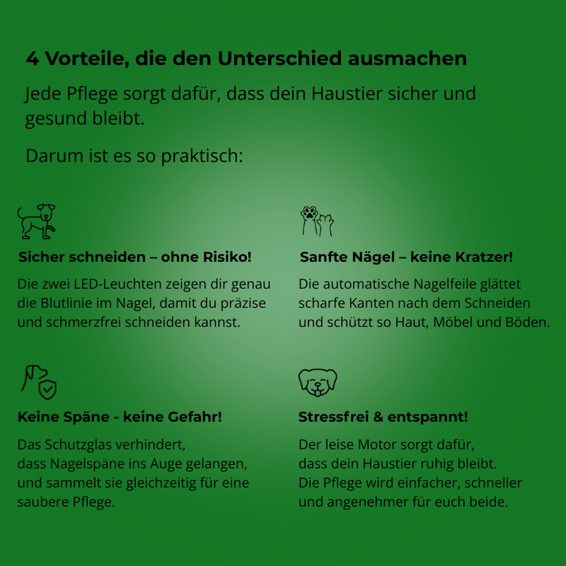 Ja, das integrierte Schutzglas beschützt die Augen der Haustiere und fängt zusätzlich Staub und Nägel ein. So wird jede Pflege einfach und sauber.
