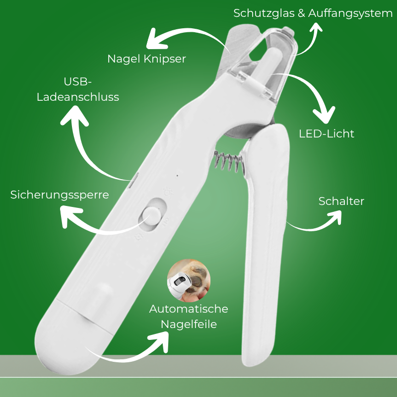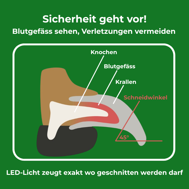 Das integrierte LED-Licht beleuchtet die Kralle und zeigt dir genau, wo die Blutgefässe und Nerven verlaufen, sodass du schmerzhafte Verletzungen sicher vermeidest.